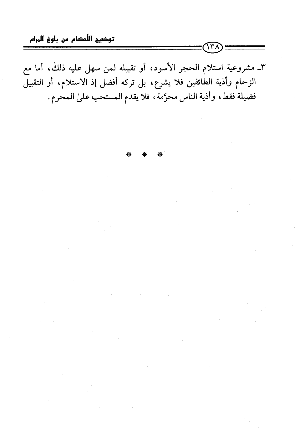 3 - مشروعية استلام الحجر الأسود، أو تقبيله لمن سهل عليه ذلك، أما مع الزحام وأذية الطائفين فلا يشرع، بل تركه أفضل إذ الاستلام، أو التقبيل فضيلة فقط، وأذية الناس محرَّمة، فلا يقدم المستحب على المحرم.