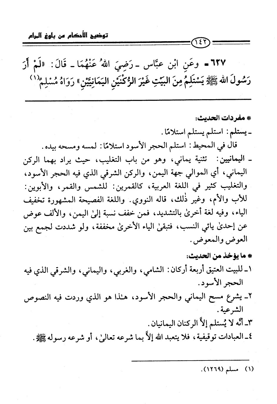 627 - وعَنِ ابْن عبَّاس -رَضِيَ اللهُ عَنْهُمَا- قَالَ: "لَمْ أرَ رَسُولَ الله -صلى الله عليه وسلم- يَسْتَلِمُ مِنَ البيْتِ غَيْرَ الرُّكْنَيْنِ اليَمَانِيَّيْنِ" رَوَاهُ مُسْلِمٌ (¬1)