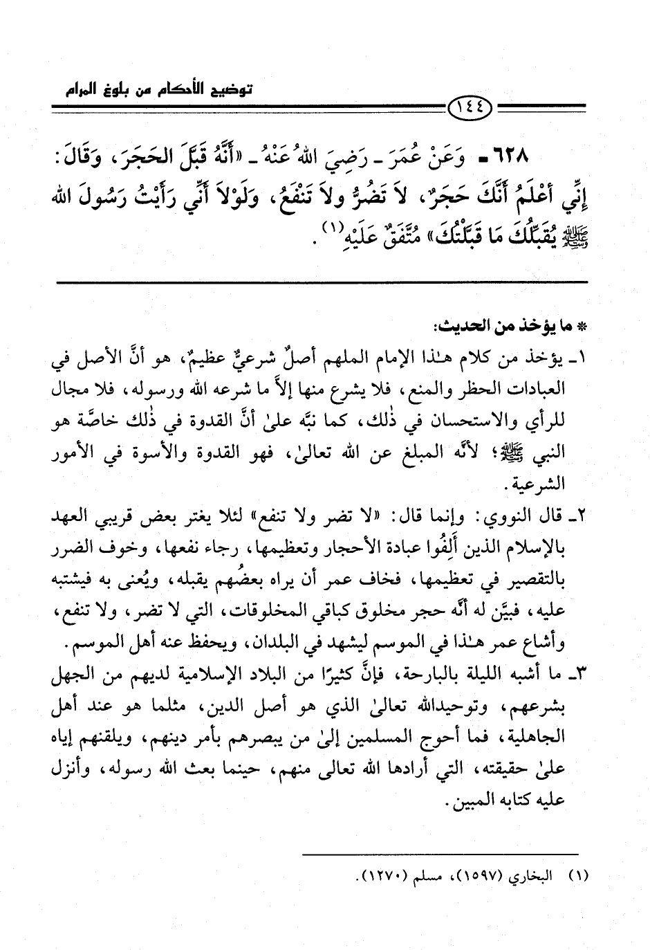 628 - وَعَنْ عُمَرَ -رَضِيَ اللهُ عَنْهُ- "أَنَّهُ قَبَّلَ الحَجَرَ، وَقَالَ: إِنِّي أعْلَمُ أنَّكَ حَجَرٌ، لاَ تَضرُّ ولاَ تَنْفَعُ، وَلَوْلاَ أنِّي رَأيْتُ رَسُولَ الله -صلى الله عليه وسلم- يُقَبلُّكَ مَا قَبَّلتُك" مُتَّفَقٌ عَلَيْهِ (¬1).
