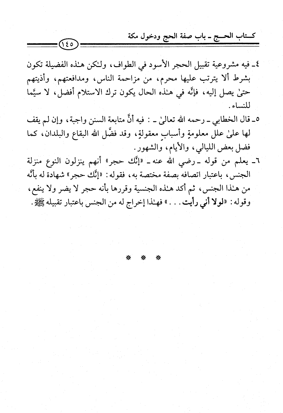5 - قال الخطابي -رحمه الله تعالى-: فيه أنَّ متابعة السنن واجبة، وإن لم يقف لها على علل معلومةٍ وأسبابٍ معقولةٍ، وقد فضَّل الله البقاع والبلدان، كما فضل بعض الليالي، والأيام، والشهور.