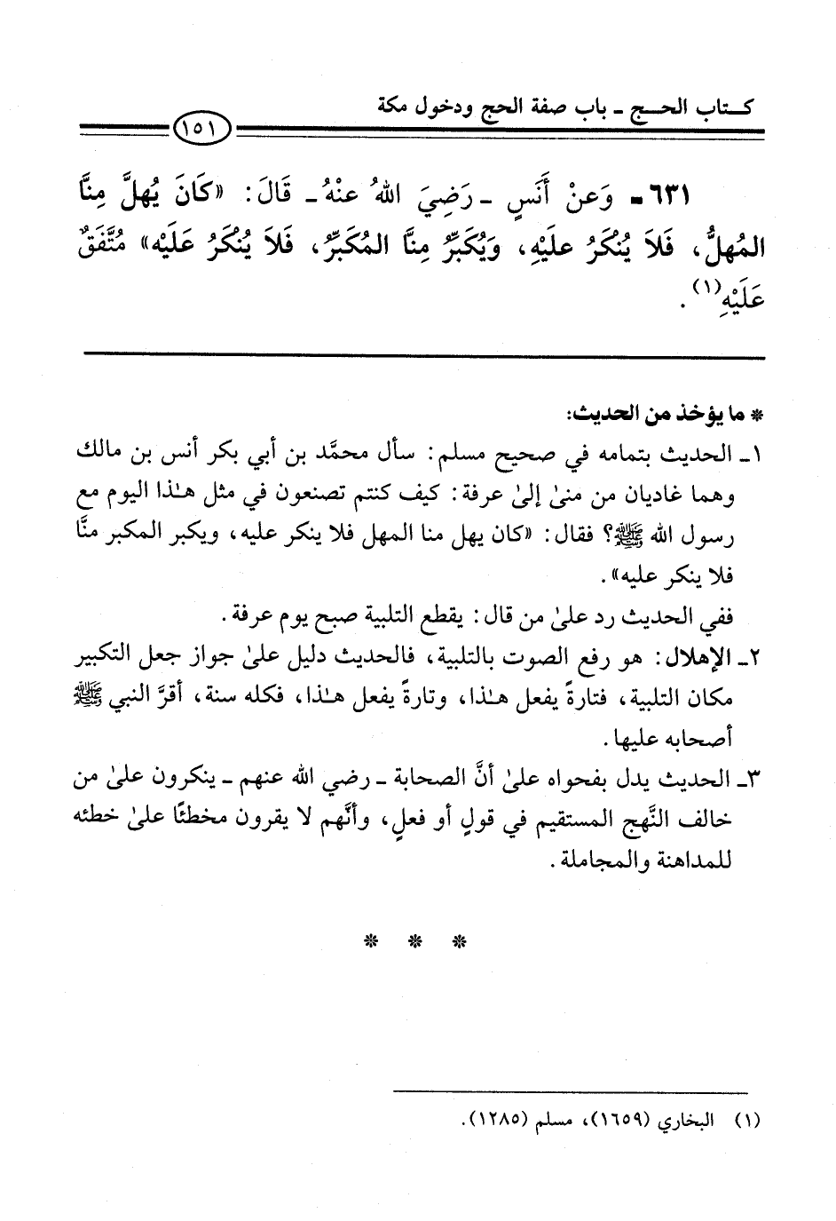 1 - الحديث بتمامه في صحيح مسلم: سأل محمَّد بن أبي بكر أنس بن مالك وهما غاديان من منى إلى عرفة: كيف كنتم تصنعون في مثل هذا اليوم مع رسول الله -صلى الله عليه وسلم-؟ فقال: "كان يهل منا المهل فلا ينكر عليه، ويكبر المكبر منَّا فلا ينكر عليه".