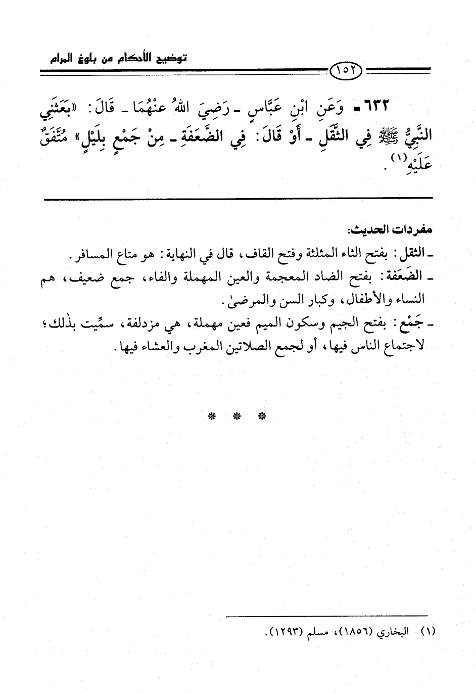632 - وَعَنِ ابْن عَبَّاسٍ -رَضِيَ اللهُ عنْهُمَا- قَالَ: "بَعَثنَي النَّبيُّ -صلى الله عليه وسلم- في الثَّقَلِ -أو قَالَ: فِي الضَّعَفَةِ- مِنْ جَمْعٍ بلَيْلٍ" مُتَّفَقٌ عَلَيْهِ (¬1).