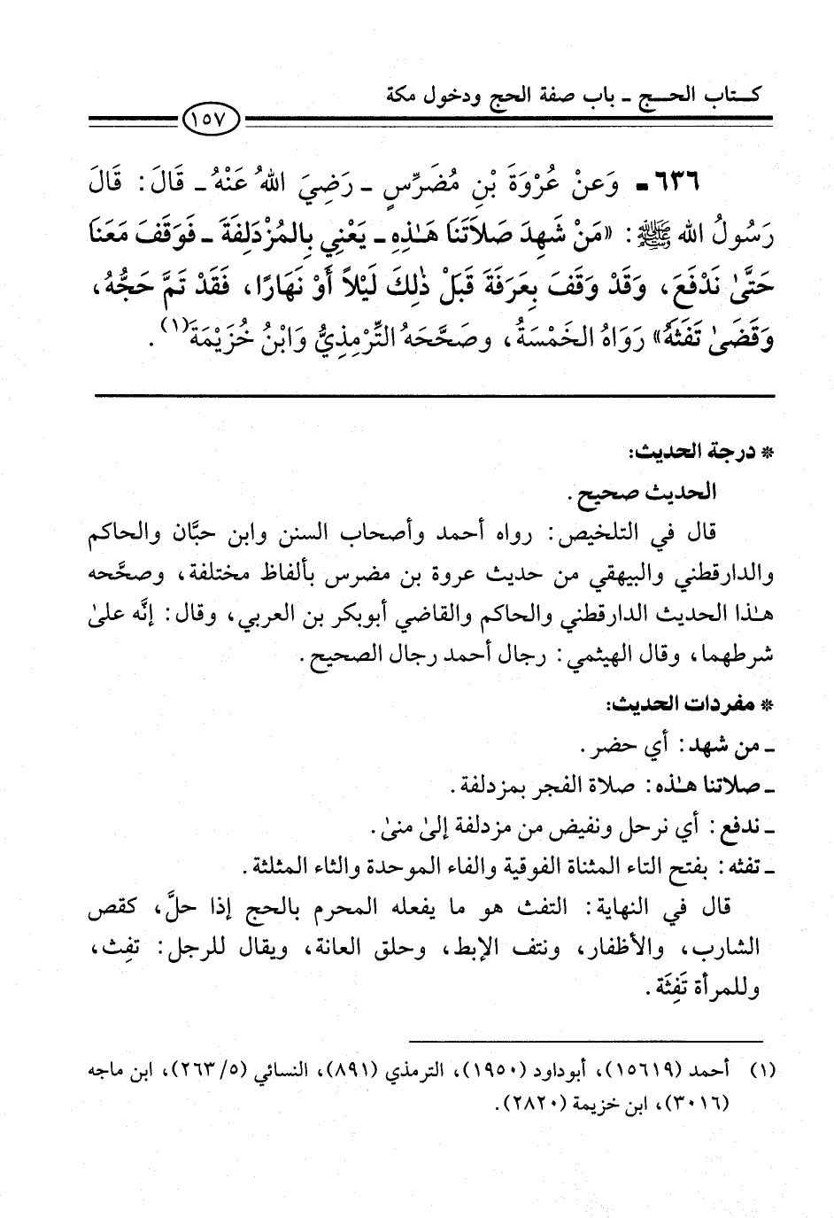 636 - وَعنْ عُرْوَةَ بْنِ مُضَرِّسٍ -رَضِيَ اللهُ عَنْهُ- قَالَ: قَالَ رَسُولُ الله -صلى الله عليه وسلم-. "مَنْ شَهِدَ صَلاَتَنا هَذِهِ -يَعْنِي بِالمُزْدَلِفَةَ- فَوَقَفَ مَعَناَ حَتَّى نَدْفَعَ، وَقَدْ وَقَفَ بِعَرَفَةَ قَبلْ ذلِكَ لَيْلاً أوْ نَهَارًا، فَقَدْ تَمَّ حَجُّةُ، وَقَضَى تَفَثَهُ" رَوَاهُ الخَمْسَةُ، وصَحَّحَهُ التِّرْمِذِيُّ وَابْنُ خُزَيْمَةَ (¬1).