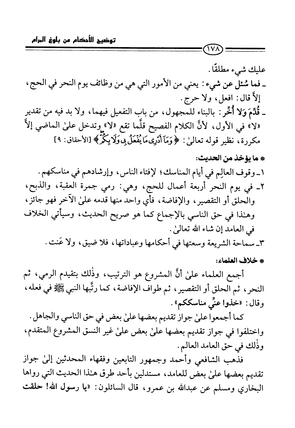 2 - في يوم النحر أربعة أعمال للحج، وهي: رمي جمرة العقبة، والذبح، والحلق أو التقصير، والإفاضة، فأي واحد منها قدمه على الآخر فهو جائز، وهذا في حق الناسي بالإجماع كما هو صريح الحديث، وسيأتي الخلاف في العامد إن شاء الله تعالى.