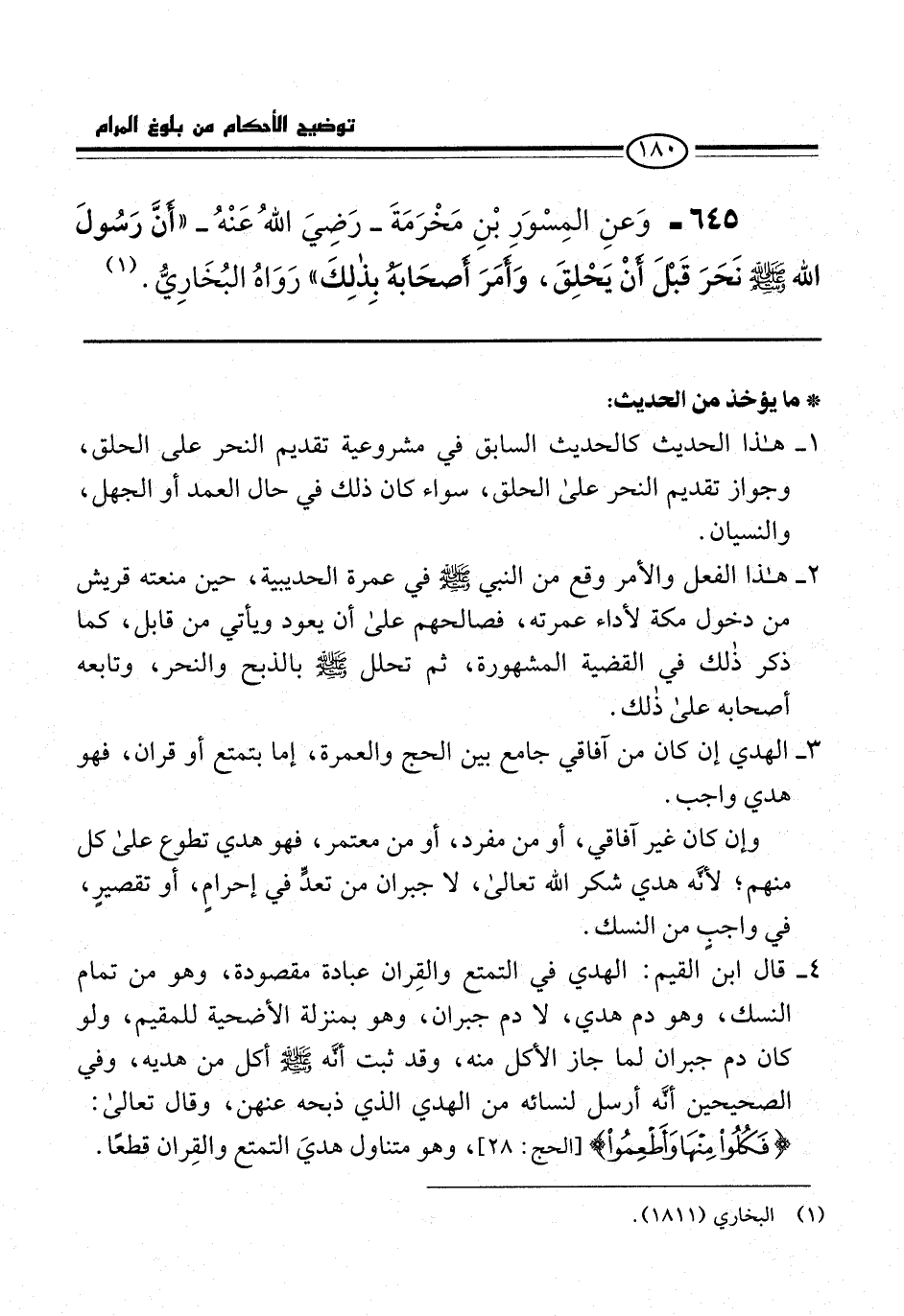 645 - وَعنِ المِسْوَرِ بْنِ مَخْرَمَةَ -رَضِيَ اللهُ عَنْهُ- "أَنَّ رَسُولَ الله -صلى الله عليه وسلم- نَحَرَ قَبْلَ أنْ يَحْلِقَ، وَأمَرَ أصحَابهُ بِذلِكَ" رَوَاهُ البُخَارِيُّ. (¬1)