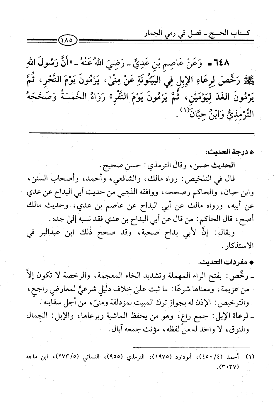 648 - وَعَنْ عَاصِمِ بْنِ عَدِيٍّ -رَضِيَ اللهُ عَنْهُ- "أَنَّ رَسُولَ اللهِ -صلى الله عليه وسلم- رخَّصَ لِرِعَاءِ الإِبِل فِي البيْتُوتَةِ عَنْ مِنًى، يَرْمُونَ يَوْمَ النَّحْرِ، ثُمَّ يَرْمُونَ الغَدَ لِيَوْمَيْنِ، ثمَّ يَرْمُونَ يَوْمَ النَّفْرِ" رَوَاهُ الخَمْسَةُ وَصَحَّحَةُ التِّرْمِذِيُّ وَابْنُ حِبَّانَ (¬1).