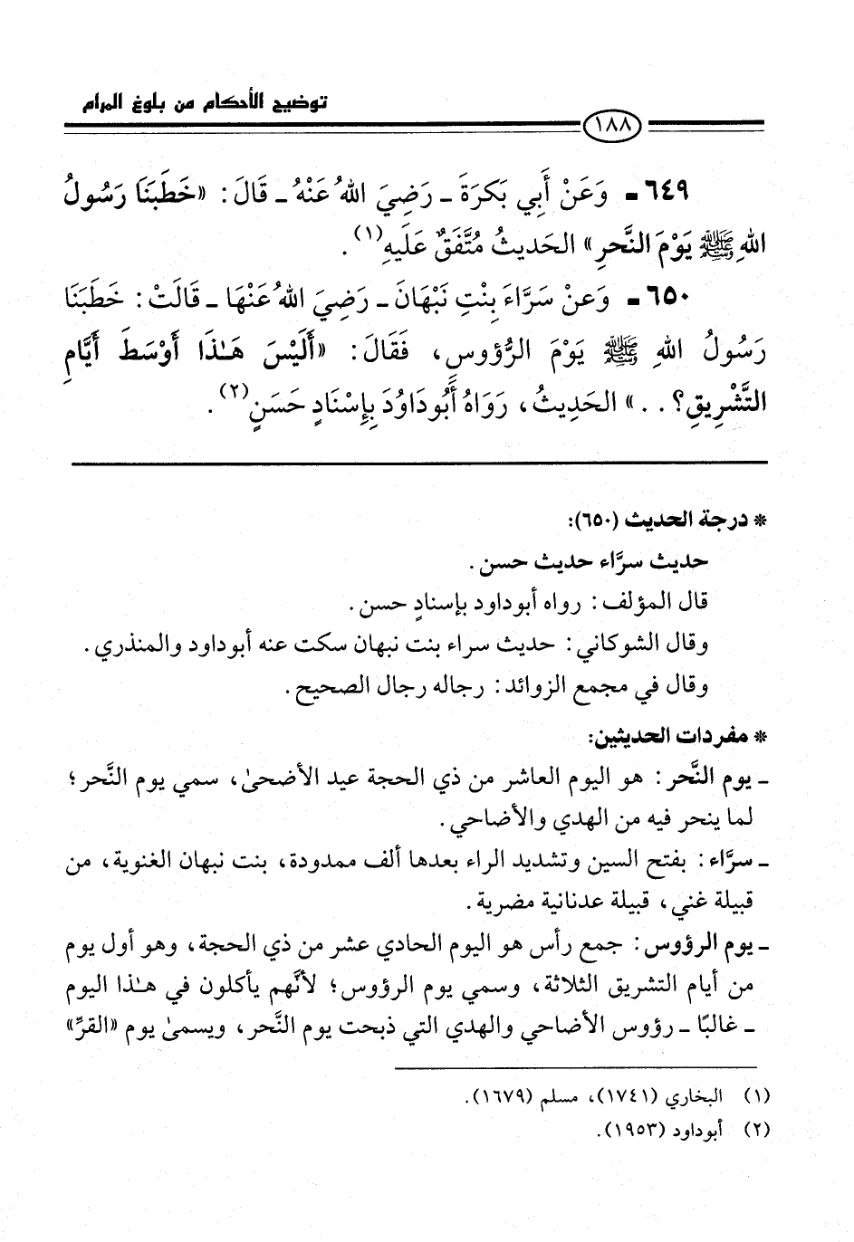 650 - وَعنْ سرَّاءَ بِنْتِ نَبْهَانَ -رَضِيَ اللهُ عَنْهَا- قَالَتْ: خَطَبَنَا رَسُولُ اللهِ -صلى الله عليه وسلم- يوْمَ الرُّؤوسِ، فَقَالَ: "أَلَيْسَ هَذَا أَوْسَطَ أَيَّامِ التَّشْرِيقِ؟ .. " الحَدِيثُ، رَواهُ أَبُو دَاوُدَ بِإِسْنَادٍ حَسَنٍ (¬2).
