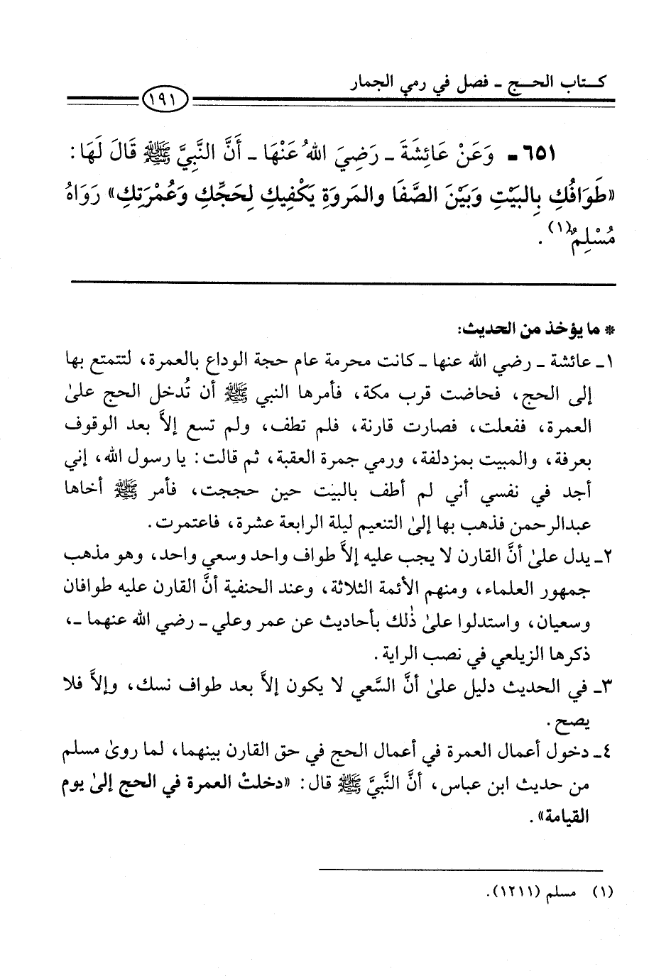 651 - وَعَنْ عَائِشَةَ -رَضِيَ اللهُ عَنْهَا- أَنَّ النَّبِيَّ -صلى الله عليه وسلم- قَالَ لَهَا: "طَوَافُكِ بالبَيْتِ وَبَيْنَ الصَّفَا والمَروَةِ يَكْفِيكِ لِحَجِّكِ وَعُمْرَتِكِ" رَوَاهُ مُسْلِمٌ (¬1).
