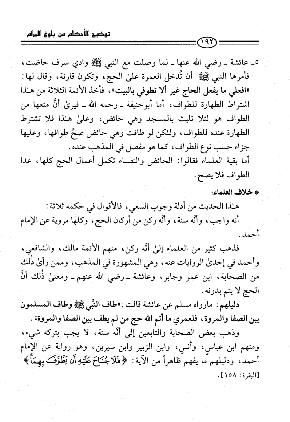 5 - عائشة -رضي الله عنها- لما وصلت مع النبي -صلى الله عليه وسلم- وادي سرف حاضت، فأمرها النبي -صلى الله عليه وسلم- أن تُدخل العمرة على الحج، وتكون قارنة، وقال لها: "افعلي ما يفعل الحاج غير ألا تطوفي بالبيت"، فأخذ الأئمة الثلاثة من هذا اشتراط الطهارة للطواف، أما أبو حنيفة -رحمه الله- فيرى أنَّ منعها من الطواف هو لئلا تلبث بالمسجد وهي حائض، وعلى هذا فلا تشترط الطهارة عنده للطواف، ولكن لو طافت وهي حائض صحَّ طوافها، وعليها جزاء حسب نوع الطواف، كما هو مفصل في المذهب عنده.