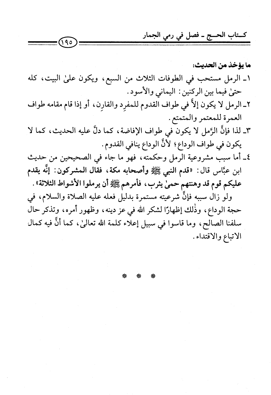 3 - لذا فإنَّ الرَّمل لا يكون في طواف الإفاضة، كما دلَّ عليه الحديث، كما لا يكون في طواف الوداع؛ لأنَّ الوداع ينافي القدوم.