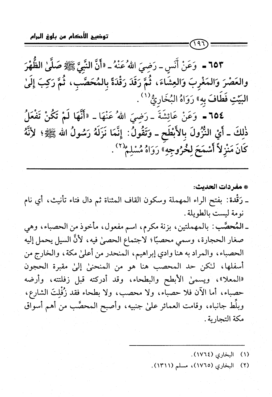 653 - وَعَنْ أَنَسٍ -رَضِيَ اللهُ عَنْهُ- "أنَّ النَّبيَّ -صلى الله عليه وسلم- صلَّى الظُّهْرَ والعَصْرَ وَالمَغْرِبَ وَالعِشَاءَ، ثُمَّ رَقَدَ رَقْدَةً بِالمُحَصَّبِ، ثُمَّ رَكبَ إِلَى البيتِ فَطَافَ بِهِ" رَوَاهُ البُخَارِيُّ (¬1).