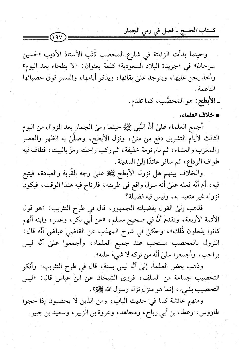 وذهب بعض العلماء إلى أنَّه ليس بسنة، قال في طرح التثريب: وأنكر التحصيب جماعة من السلف، فروى الشيخان عن ابن عباس قال: "ليس التحصيب بشيء، إنما هو منزل نزله رسول الله -صلى الله عليه وسلم-".