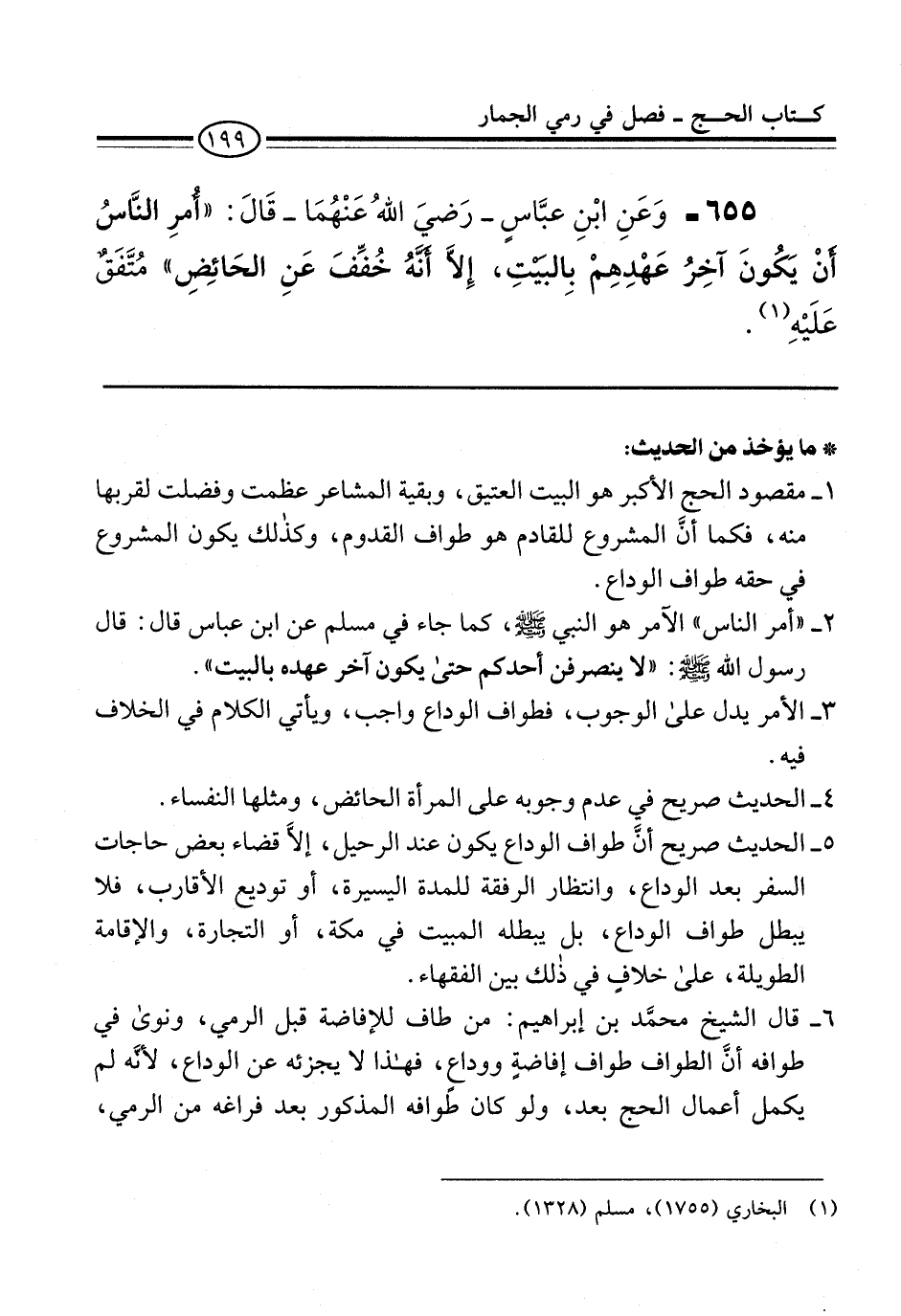 655 - وَعَنِ ابْنِ عبَّاسٍ -رَضيَ اللهُ عَنْهُمَا- قَالَ: "أُمرِ النَّاسُ أنْ يَكُونَ آخِرُ عَهْدِهِمْ بِالبَيْتِ، إِلاَّ أَنَّهُ خُفِّفَ عَنِ الحَائِضِ" مُتَّفَقٌ عَلَيْهِ (¬1).