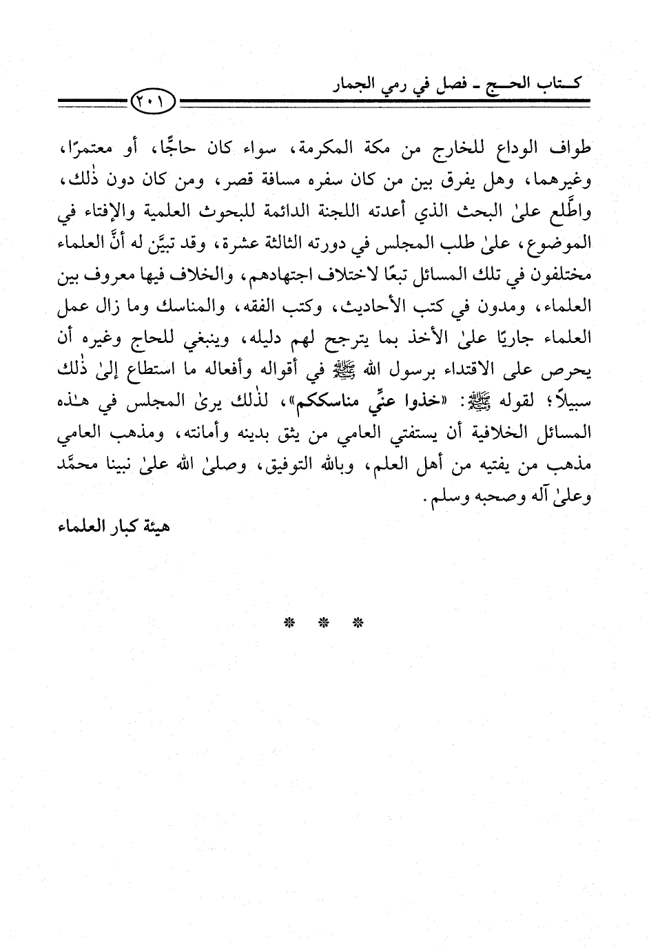 طواف الوداع للخارج من مكة المكرمة، سواء كان حاجًّا، أو معتمرًا، وغيرهما، وهل يفرق بين من كان سفره مسافة قصر، ومن كان دون ذلك، واطَّلع على البحث الذي أعدته اللجنة الدائمة للبحوث العلمية والإفتاء في الموضوع، على طلب المجلس في دورته الثالثة عشرة، وقد تبيَّن له أنَّ العلماء مختلفون في تلك المسائل تبعًا لاختلاف اجتهادهم، والخلاف فيها معروف بين العلماء، ومدون في كتب الأحاديث، وكتب الفقه، والمناسك وما زال عمل العلماء جاريًا على الأخذ بما يترجح لهم دليله، وينبغي للحاج وغيره أن يحرص على الاقتداء برسول الله -صلى الله عليه وسلم- في أقواله وأفعاله ما استطاع إلى ذلك سبيلاً؛ لقوله -صلى الله عليه وسلم-: "خذوا عنِّي مناسككم"، لذلك يرى المجلس في هذه المسائل الخلافية أن يستفتي العامي من يثق بدينه وأمانته، ومذهب العامي مذهب من يفتيه من أهل العلم، وبالله التوفيق، وصلى الله على نبينا محمَّد وعلى آله وصحبه وسلم.