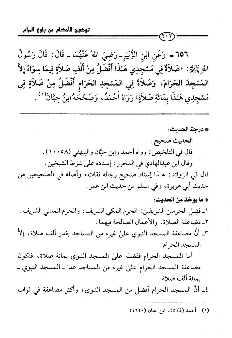 656 - وَعَنِ ابْنِ الزُّبَيْرِ -رَضِيَ اللهُ عَنْهُمَا- قَالَ: قَالَ رَسُولُ اللهِ -صلى الله عليه وسلم-: "صَلاةٌ فِي مَسْجِدِي هَذَا أفْضَلُ مِنْ ألْفِ صَلاَةٍ فِيمَا سِوَاهُ إلاَّ المَسْجِدَ الحَرَامَ، وَصَلاةٌ فِي المَسجِدِ الحَرَامِ أفْضَلُ مِنْ صَلاَةٍ فِي مَسْجِدِي هَذَا بِمَائة صَلاَةٍ" رَوَاهُ أَحْمَدُ، وَصَحَّحَهُ ابنُ حِبَّانَ (¬1).