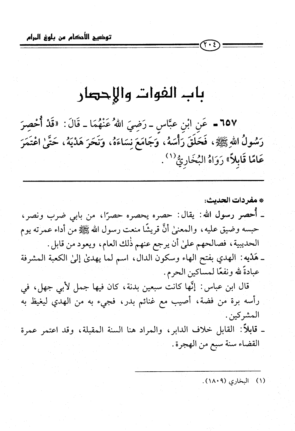 657 - عَنِ ابْنِ عبَّاسٍ -رَضِيَ اللهُ عَنْهُمَا- قَالَ: "قَدْ أُحْصِرَ رَسُولُ اللهِ -صلى الله عليه وسلم-، فَحَلَقَ رَأْسَهُ، وَجَامَعَ نِسَاءَهُ، وَنَحَرَ هَدْيَهُ، حَتَّى اعْتَمَرَ عَامًا قَابِلاً" رَوَاهُ البُخَارِيُّ (¬1).