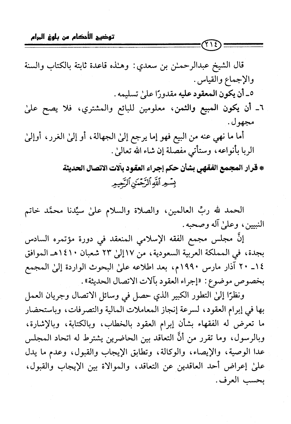إنَّ مجلس مجمع الفقه الإسلامي المنعقد في دورة مؤتمره السادس بجدة، في المملكة العربية السعودية، من 17 إلى 23 شعبان 1410 هـ الموافق 14 - 20 آذار مارس 1990 م، بعد اطلاعه على البحوث الواردة إلى المجمع بخصوص موضوع: "إجراء العقود بآلات الاتصال الحديثة".