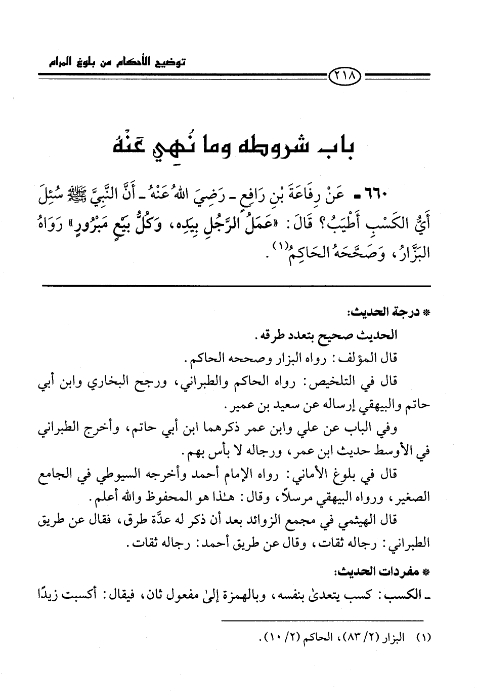 660 - عَنْ رِفَاعَةَ بْنِ رَافِعٍ -رَضِيَ اللهُ عَنْهُ- أَنَّ النَّبِيَّ -صلى الله عليه وسلم- سُئِلَ أَيُّ الكَسْبِ أَطْيَبُ؟ قَالَ: "عَمَلُ الرَّجُلِ بِيَدِه، وَكُلُّ بَيْعٍ مَبْرُورٍ" رَوَاهُ البَزَّارُ، وَصَحَّحَهُ الحَاكِمُ (¬1).