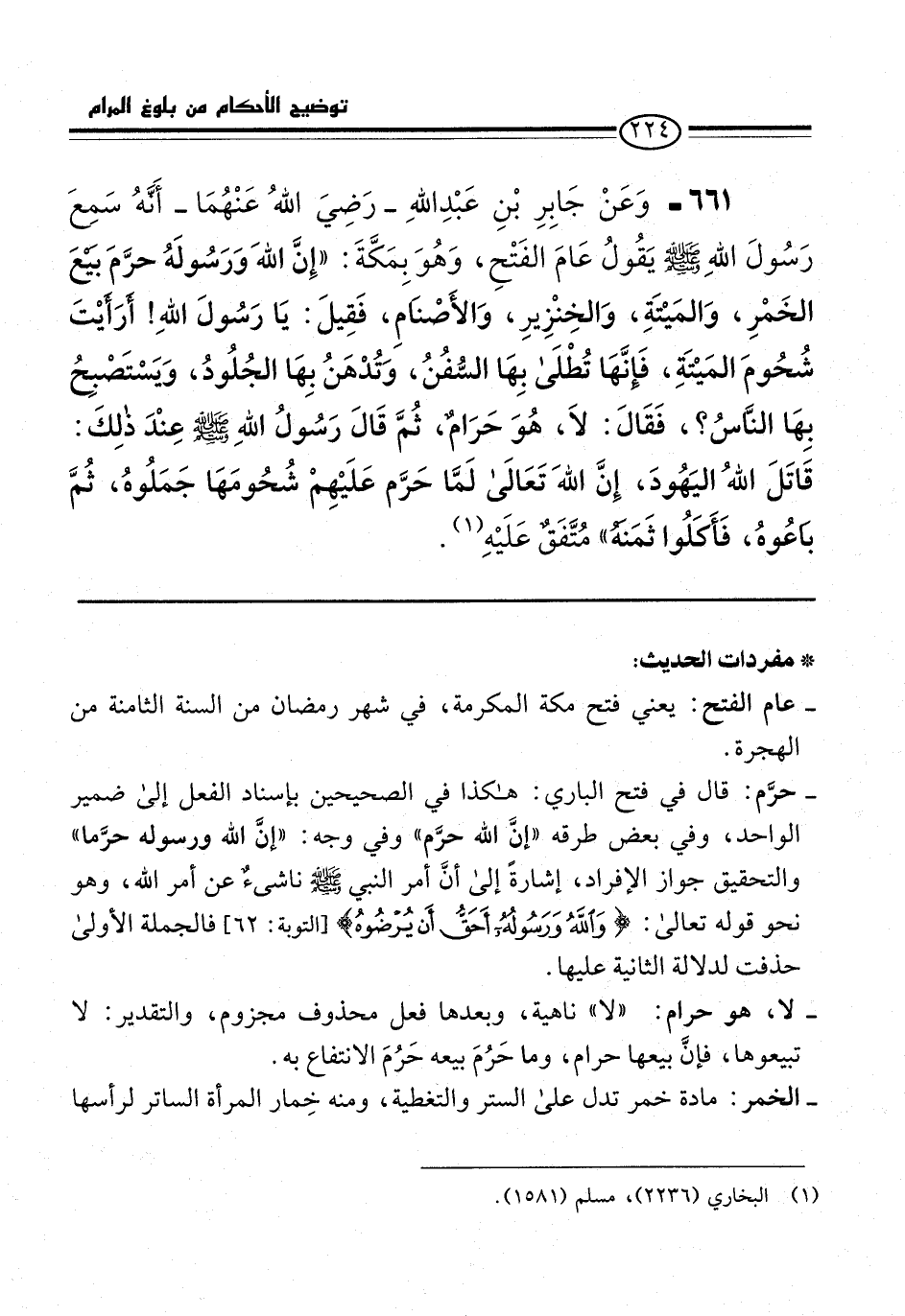 661 - وَعَنْ جَابِرِ بْنِ عَبْدِ اللهِ -رَضِيَ اللهُ عَنْهُمَا- أَنَّهُ سَمِعَ رَسُولَ اللهِ -صلى الله عليه وسلم- يقُولُ عَامَ الفَتْحِ، وَهُوَ بمَكَّةَ: "إِنَّ اللهَ وَرَسُولَهُ حرَّمَ بيَعَ الخَمْرِ، وَالمَيْتَةِ، وَالخِنْزِيرِ، وَالأَصْنامِ، فَقِيلَ: يَا رَسُولَ اللهِ! أَرَأَيْتَ شُحُومَ المَيْتَةِ، فَإنَّهَا تُطْلَى بِهَا السُّفُنُ، وَتُدْهَنُ بِهَا الجُلُودُ، وَيَسْتَصْبِحُ بِهَا النَّاسُ؟، فَقَالَ: لاَ، هُوَ حَرَامٌ، ثُمَّ قَالَ رَسُولُ اللهِ -صلى الله عليه وسلم- عِنْدَ ذلِكَ: قَاتَلَ اللهُ اليَهُودَ، إِنَّ اللهَ تَعَالَى لَمَّا حَرَّم عَلَيْهِمْ شُحُومَهَا جَمَلُوهُ، ثُمَّ باعُوهُ، فَأَكَلُوا ثَمَنه" مُتَّفَقٌ عَلَيْهِ (¬1).