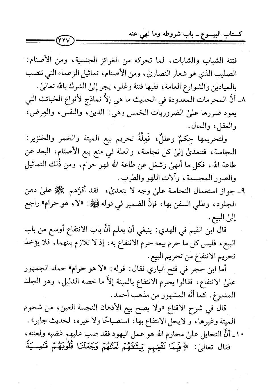 9 - جواز استعمال النجاسة على وجه لا يتعدى، فقد أقرَّهم -صلى الله عليه وسلم- على دهن الجلود، وطلي السفن بها، فإنَّ الضمير في قوله -صلى الله عليه وسلم-: "لا، هو حرام" راجع إلى البيع.