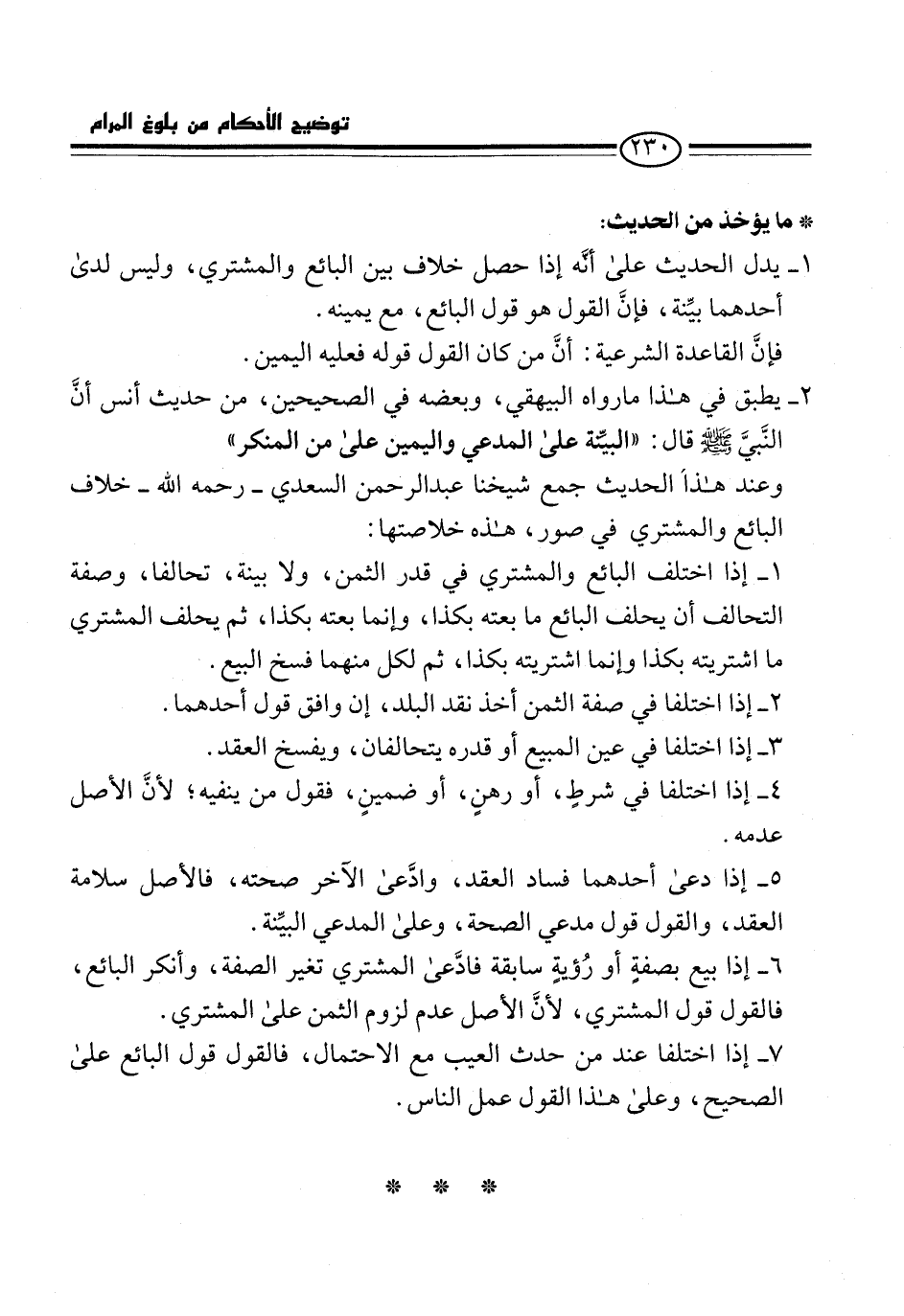 وعند هذا الحديث جمع شيخنا عبد الرحمن السعدي -رحمه الله- خلاف البائع والمشتري في صور، هذه خلاصتها: