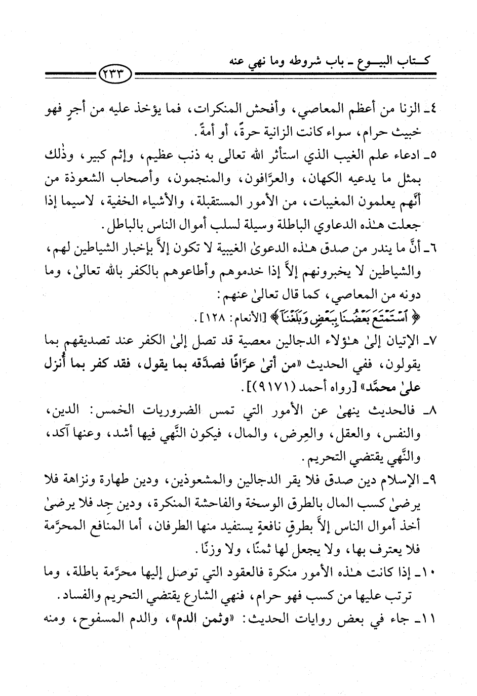 9 - الإسلام دين صدق فلا يقر الدجالين والمشعوذين، ودين طهارة ونزاهة فلا يرضى كسب المال بالطرق الوسخة والفاحشة المنكرة، ودين جِد فلا يرضى أخذ أموال الناس إلاَّ بطرقٍ نافعةٍ يستفيد منها الطرفان، أما المنَافع المحرَّمة فلا يعترف بها، ولا يجعل لها ثمنًا، ولا وزنًا.