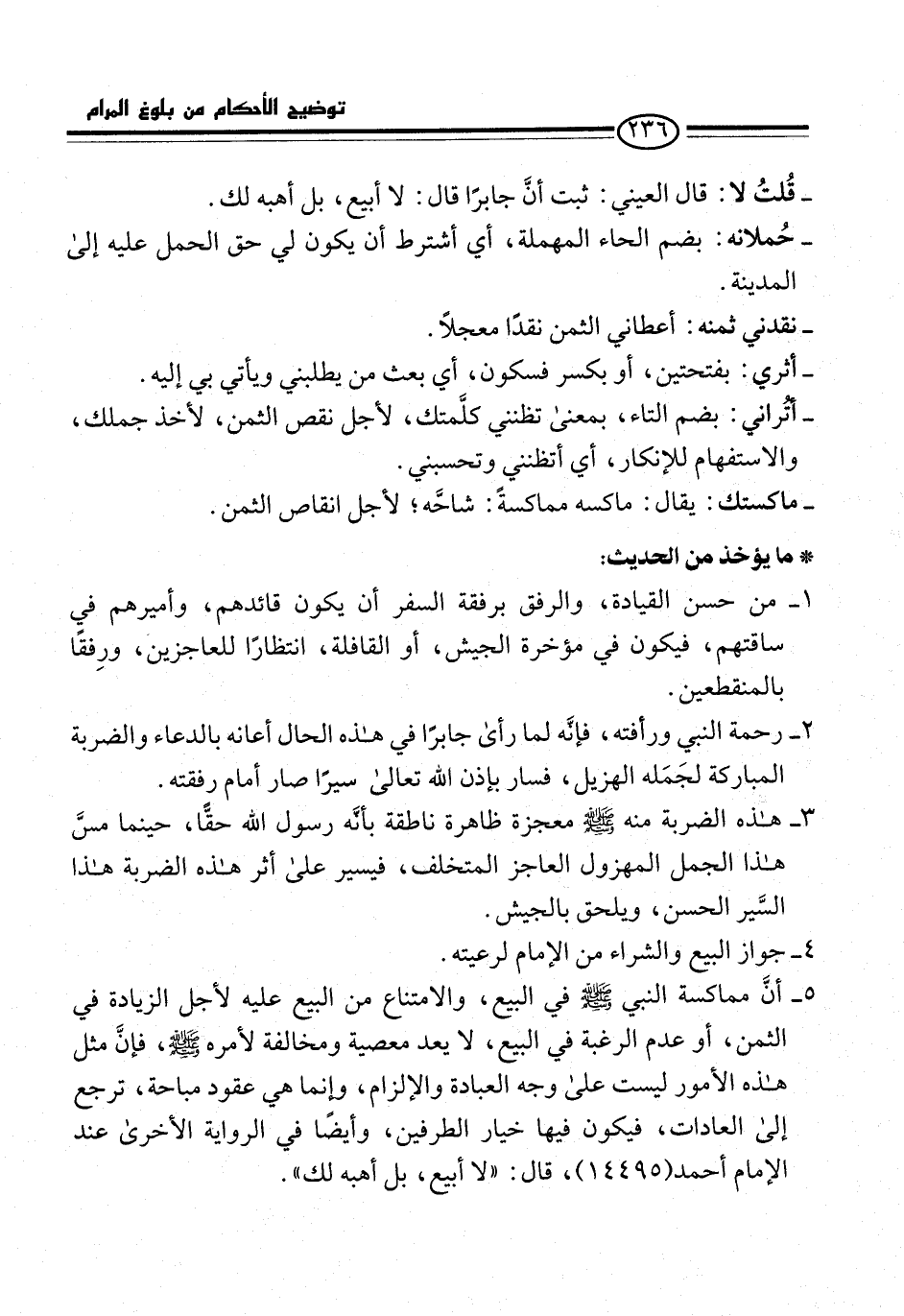 5 - أنَّ مماكسة النبي -صلى الله عليه وسلم- في البيع، والامتناع من البيع عليه لأجل الزيادة في الثمن، أو عدم الرغبة في البيع، لا يعد معصية ومخالفة لأمره -صلى الله عليه وسلم-، فإنَّ مثل هذه الأمور ليست على وجه العبادة والإلزام، وإنما هي عقود مباحة، ترجع إلى العادات، فيكون فيها خيار الطرفين، وأيضًا في الرواية الأخرى عند الإمام أحمد (14495)، قال: "لا أبيع، بل أهبه لك".