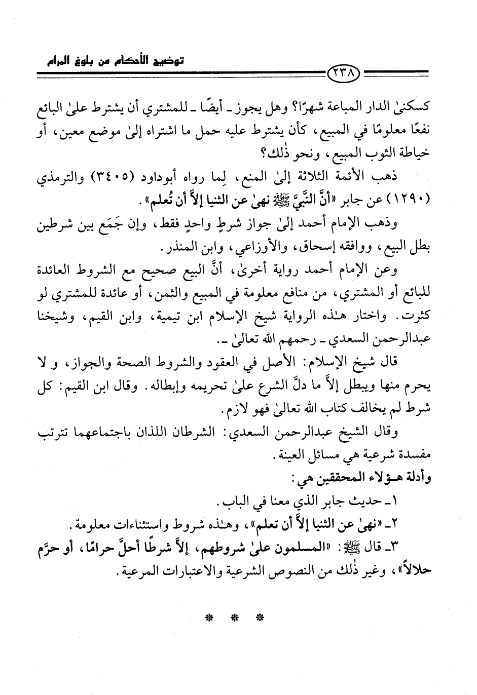 وعن الإمام أحمد رواية أخرى، أنَّ البيع صحيح مع الشروط العائدة للبائع أو المشتري، من منافع معلومة في المبيع والثمن، أو عائدة للمشتري لو كثرت. واختار هذه الرواية شيخ الإسلام ابن تيمية، وابن القيم، وشيخنا عبد الرحمن السعدي -رحمهم الله تعالى-.