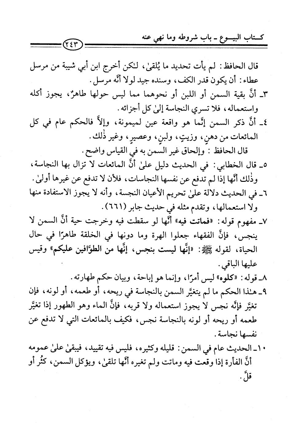 9 - هذا الحكم ما لم يتغيَّر السمن بالنجاسة في ريحه، أو طعمه، أو لونه، فإن تغيَّر فإنَّه نجس لا يجوز استعماله ولا قربه، فإنَّ الماء وهو الطهور إذا تغيَّر طعمه أو ريحه أو لونه بالنجاسة نجس، فكيف بالمائعات التي لا تدفع عن نفسها نجاسة.