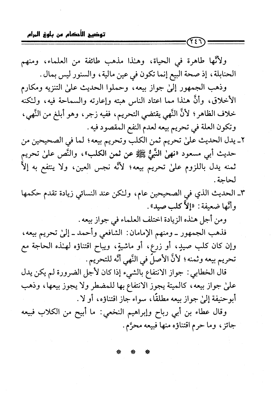 فذهب الجمهور -ومنهم الإمامان: الشافعي وأحمد- إلى تحريم بيعه، وإن كان كلب صيدٍ، أو زرعٍ، أو ماشيةٍ، ويباح اقتناؤه لهذه الحاجة مع تحريم بيعه وثمنه، لأنَّ الأصل في النَّهي أنَّه للتحريم.