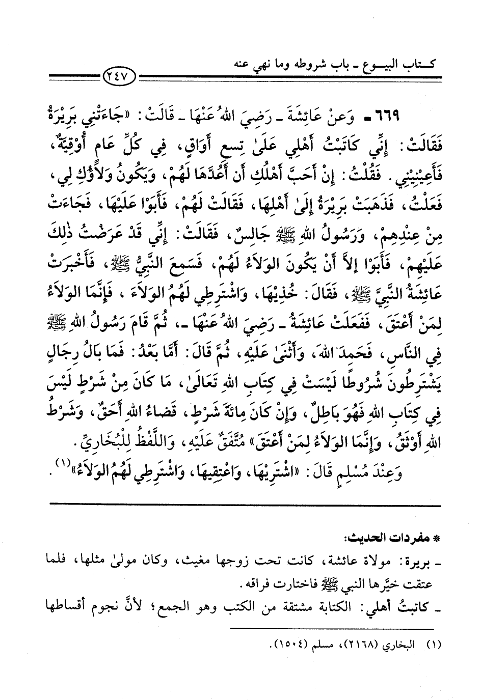 669 - وَعنْ عَائِشَةَ -رَضِيَ اللهُ عَنْهَا- قَالَتْ: "جَاءَتْنِي بَرِيْرَهُّ فَقَالَتْ: إِنِّي كاتَبْتُ أَهْلِي عَلَى تِسع أَوَاقٍ، فِي كُلِّ عَامٍ أُوْقِيةٌ، فَأَعِيْنِيْنِي. فَقُلْتُ: إِنْ أَحَبَّ أَهْلُكِ أَن أَعُدَّهَا لَهُمْ، وَيَكُونُ وَلاَؤُكِ لِي، فَعَلْتُ، فَذَهَبَتْ بَرِيْرَةُ الَى أَهْلِهَا، فَقَالَتْ لَهُمْ، فَأَبَوْا عَلَيْهَا، فَجَاءَتْ مِنْ عِنْدِهِمْ، وَرَسُولُ اللهِ -صلى الله عليه وسلم- جالِسٌ، فَقَالَتْ: إِنِّي قَدْ عَرَضْتُ ذلِكَ عَلَيْهِمْ، فَأَبَوْا إلاَّ أنْ يَكُونَ الوَلاَءُ لَهُمْ، فَسَمعَ النَّبِيُّ -صلى الله عليه وسلم-، فَأَخْبرَتْ عَائشِةُ النَّبِيَّ -صلى الله عليه وسلم-، فَقَالَ: خُذِيْهَا، وَاشْتَرِطِي لَهُمُ الوَلاَءَ، فَإنَّمَا الوَلاَءُ لِمَنْ أعْتَقَ، فَفَعَلَتْ عَائشِةُ -رَضِيَ اللهُ عَنْهَا-، ثُمَّ قَامَ رَسُولُ اللهِ -صلى الله عليه وسلم- فِي النَّاسِ، فَحَمِد اللهَ، وَأثْنَى عَلَيْهِ، ثُمَّ قَالَ: أمَّا بَعْدُ: فَمَا بَالُ رِجَالٍ يَشْتَرِطُونَ شُرُوطًا لَيْسَتْ فِي كِتَابِ اللهِ تَعَالَى، مَا كانَ مِنْ شَرْطٍ لَيْسَ فِي كتَابِ اللهِ فَهُوَ باطلٌ، وَإِنْ كانَ مِائه شَرْطٍ، قَضاءُ اللهِ أحَقٌ، وَشَرْطُ اللهِ اوْثَقُ، وَإِنَّمَا الوَلاَءُ لِمَنْ أَعْتَقَ" مُتَّفَقٌ عَلَيْهِ، وَاللَّفْظُ لِلْبُخَارِيِّ.