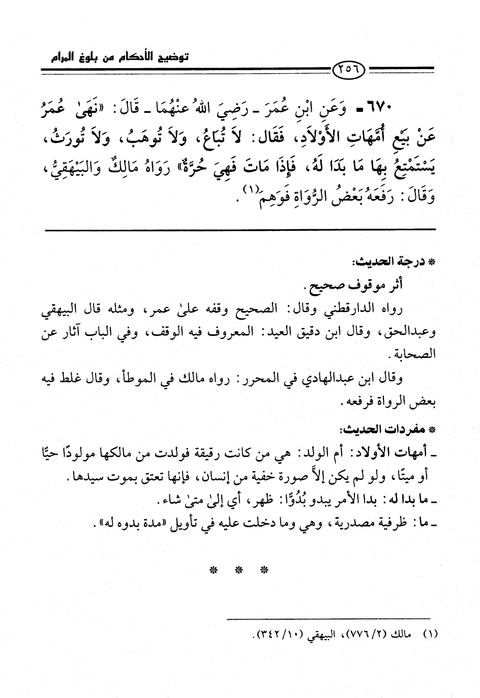 670 - وَعَن ابْن عُمَرَ -رَضِىَ اللهُ عنْهُمَا- قَالَ: "نَهَى عُمَرُ عَنْ بَيْعِ أُمَّهاتِ الأوْلادِ، فقال: لا تُباعُ، وَلا تُوهَبُ، وَلا تُورثُ، يَسْتَمْتِعُ بِهَا مَا بَدَا لَهُ، فَإذَا مَاتَ فَهِيَ حُرّةٌ" رَوَاهُ مَالكٌ وَالبَيْهَقِيُّ، وَقَالَ: رَفَعَهُ بَعْضُ الرُّوَاةِ فَوَهِمَ (¬1).