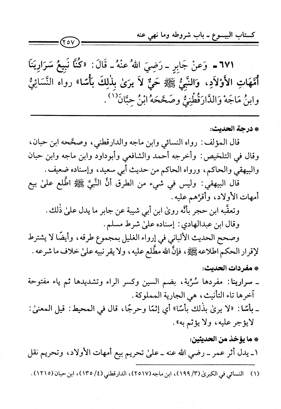 671 - وَعنْ جَابِرٍ -رَضِيَ اللهُ عنْهُ- قَالَ: "كُنَّا نَبِيعُ سَرَارِيَنا أُمَّهَاتِ الأَوْلاَدِ، وَالنَّبيُّ -صلى الله عليه وسلم- حَيٌّ لاَ يرَى بذلِكَ بأْسًا" رواه النَّسَائيُّ وابنُ مَاجَهْ وَالدَّارَقُطْنِيُّ وصَحَّحَهُ ابْنُ حِبَّانَ (¬1).