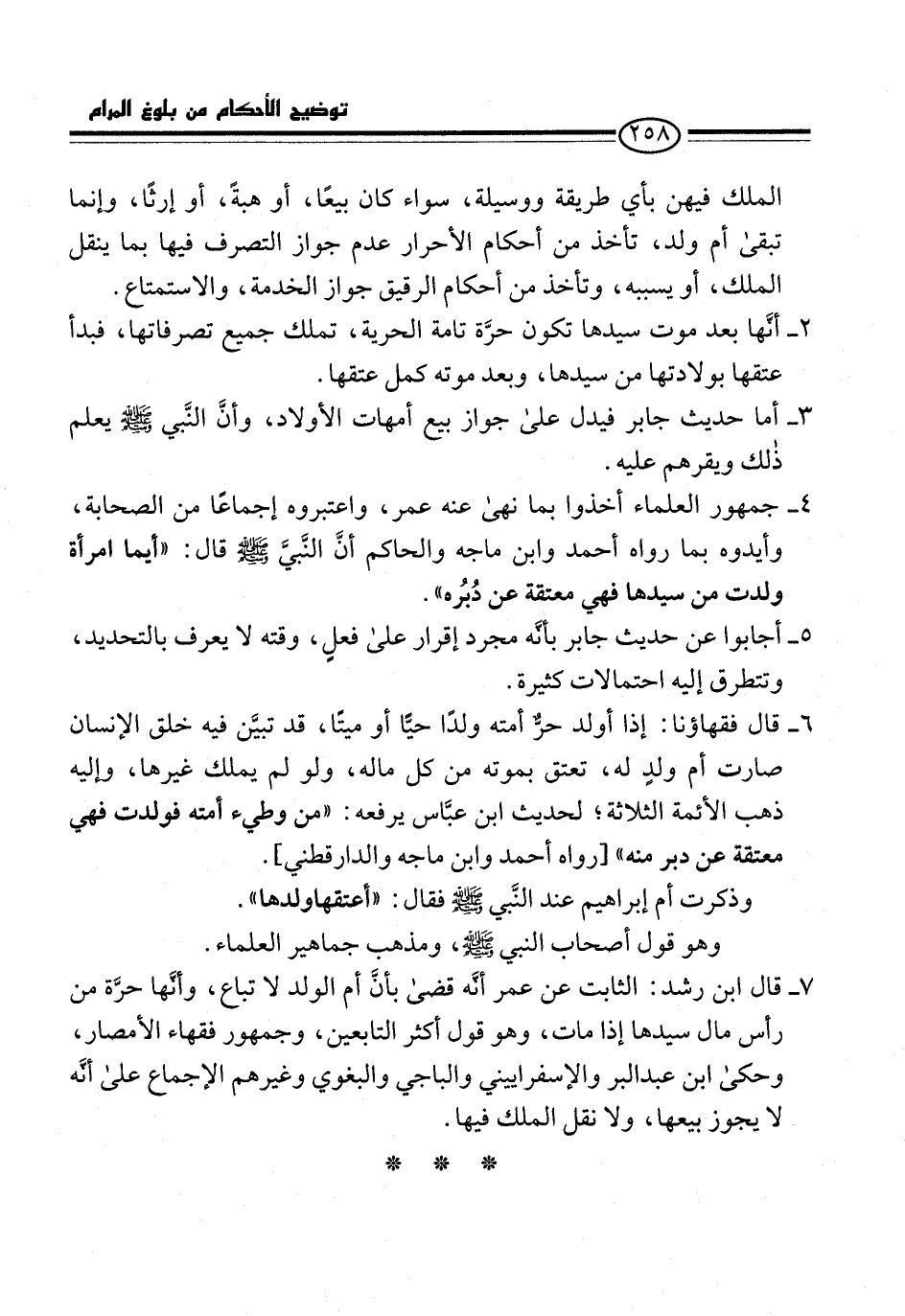 7 - قال ابن رشد: الثابت عن عمر أنَّه قضى بأنَّ أم الولد لا تباع، وأنَّها حرَّة من رأس مال سيدها إذا مات، وهو قول أكثر التابعين، وجمهور فقهاء الأمصار، وحكى ابن عبد البر والإسفراييني والباجي والبغوي وغيرهم الإجماع على أنَّه لا يجوز بيعها، ولا نقل الملك فيها.