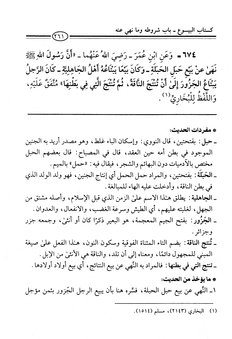 674 - وَعَنِ ابْنِ عُمَرَ -رَضِيَ اللهُ عَنْهُما- "أَنَّ رَسُولَ اللهِ -صلى الله عليه وسلم- نَهَى عنْ بيعِ حَبل الحَبلَةِ -وَكَانَ بَيْعًا يَبْتَاعُهُ أهْلُ الجَاهِلِيَّةِ- كَانَ الرَّجلُ يَبْتَاعُ الجَزُورَ إِلَى أنْ تُنْتَجَ النَّاقَةُ، ثُمَّ تُنْتَجَ الَّتِي فِي بَطْنِهَا" مُتَّفَقٌ عَلَيْهِ، وَاللَّفْظُ لِلْبُخَارِيِّ (¬1).