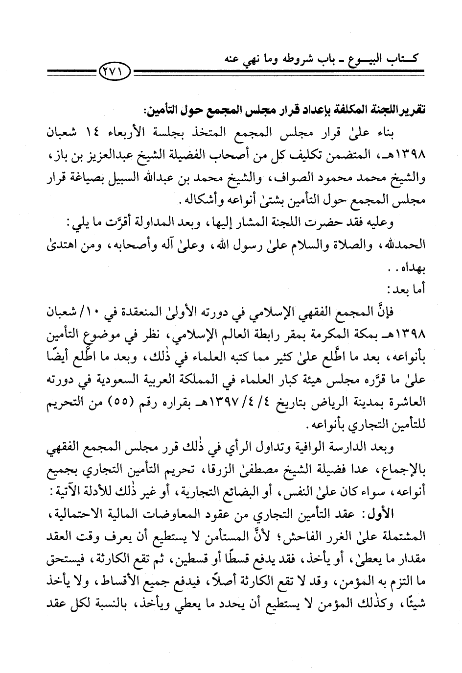 بناء على قرار مجلس المجمع المتخذ بجلسة الأربعاء 14 شعبان 1398 هـ، المتضمن تكليف كل من أصحاب الفضيلة الشيخ عبد العزيز بن باز، والشيخ محمد محمود الصواف، والشيخ محمد بن عبد الله السبيل بصياغة قرار مجلس المجمع حول التأمين بشتى أنواعه وأشكاله.
