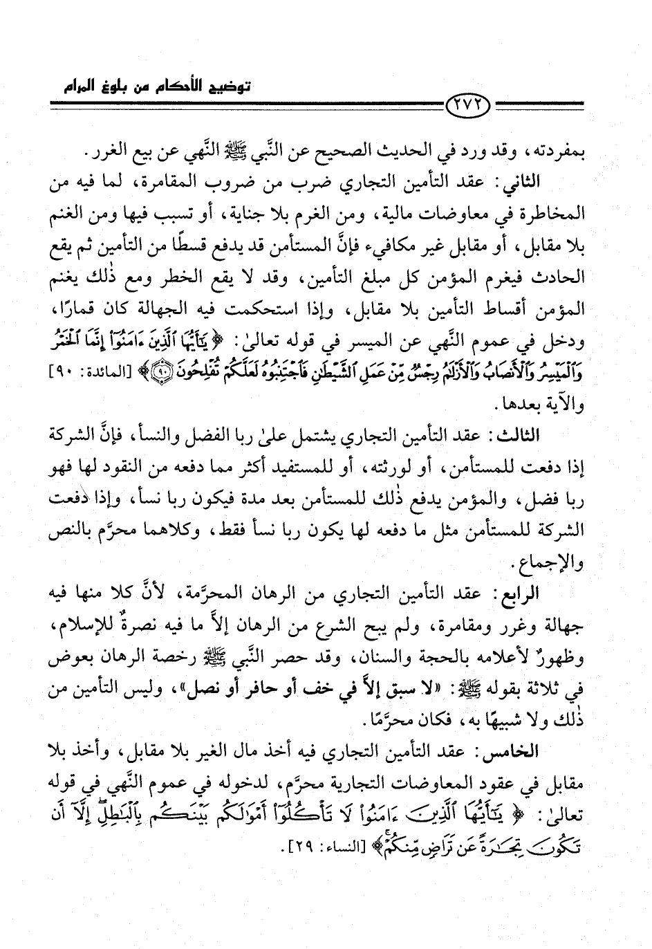 الرابع: عقد التأمين التجاري من الرهان المحرَّمة، لأنَّ كلا منها فيه جهالة وغرر ومقامرة، ولم يبح الشرع من الرهان إلاَّ ما فيه نصرةٌ للإسلام، وظهورٌ لأعلامه بالحجة والسنان، وقد حصر النَّبي -صلى الله عليه وسلم- رخصة الرهان بعوض في ثلاثة بقوله -صلى الله عليه وسلم-: "لا سبق إلاَّ في خف أو حافر أو نصل"، وليس التأمين من ذلك ولا شبيهًا به، فكان محرَّمًا.
