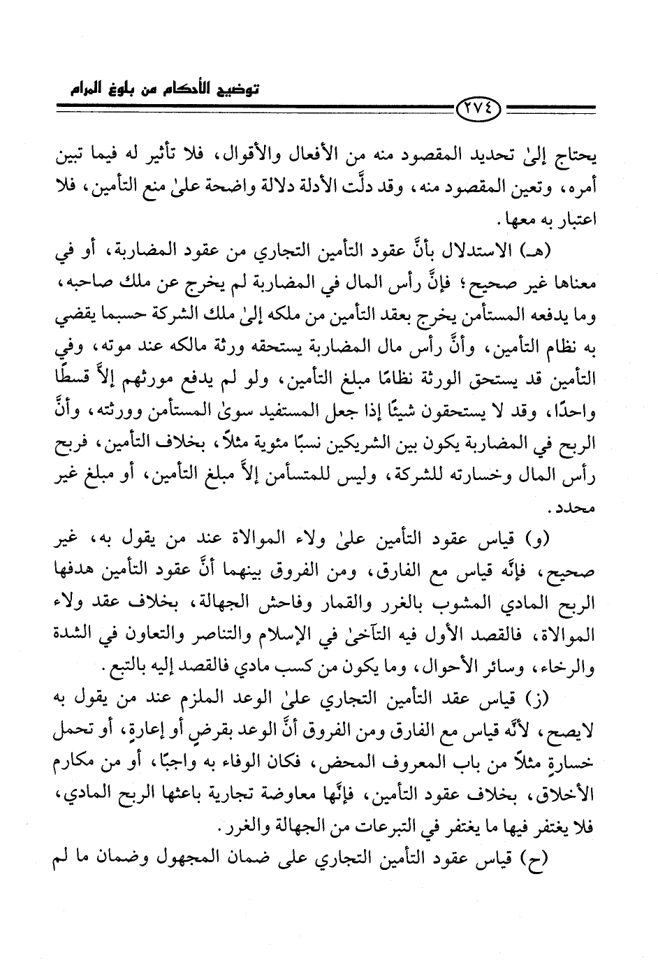 (و) قياس عقود التأمين على ولاء الموالاة عند من يقول به، غير صحيح، فإنَّه قياس مع الفارق، ومن الفروق بينهما أنَّ عقود التأمين هدفها الربح المادي المشوب بالغرر والقمار وفاحش الجهالة، بخلاف عقد ولاء الموالاة، فالقصد الأول فيه التآخى في الإسلام والتناصر والتعاون في الشدة والرخاء، وسائر الأحوال، وما يكون من كسب مادي فالقصد إليه بالتبع.