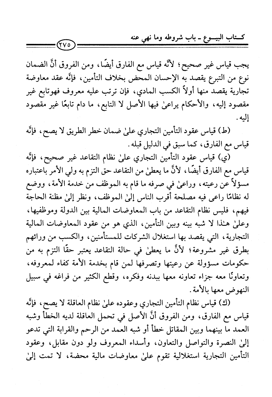 (ط) قياس عقود التأمين التجاري على ضمان خطر الطريق لا يصح، فإنَّه قياس مع الفارق، كما سبق في الدليل قبله.