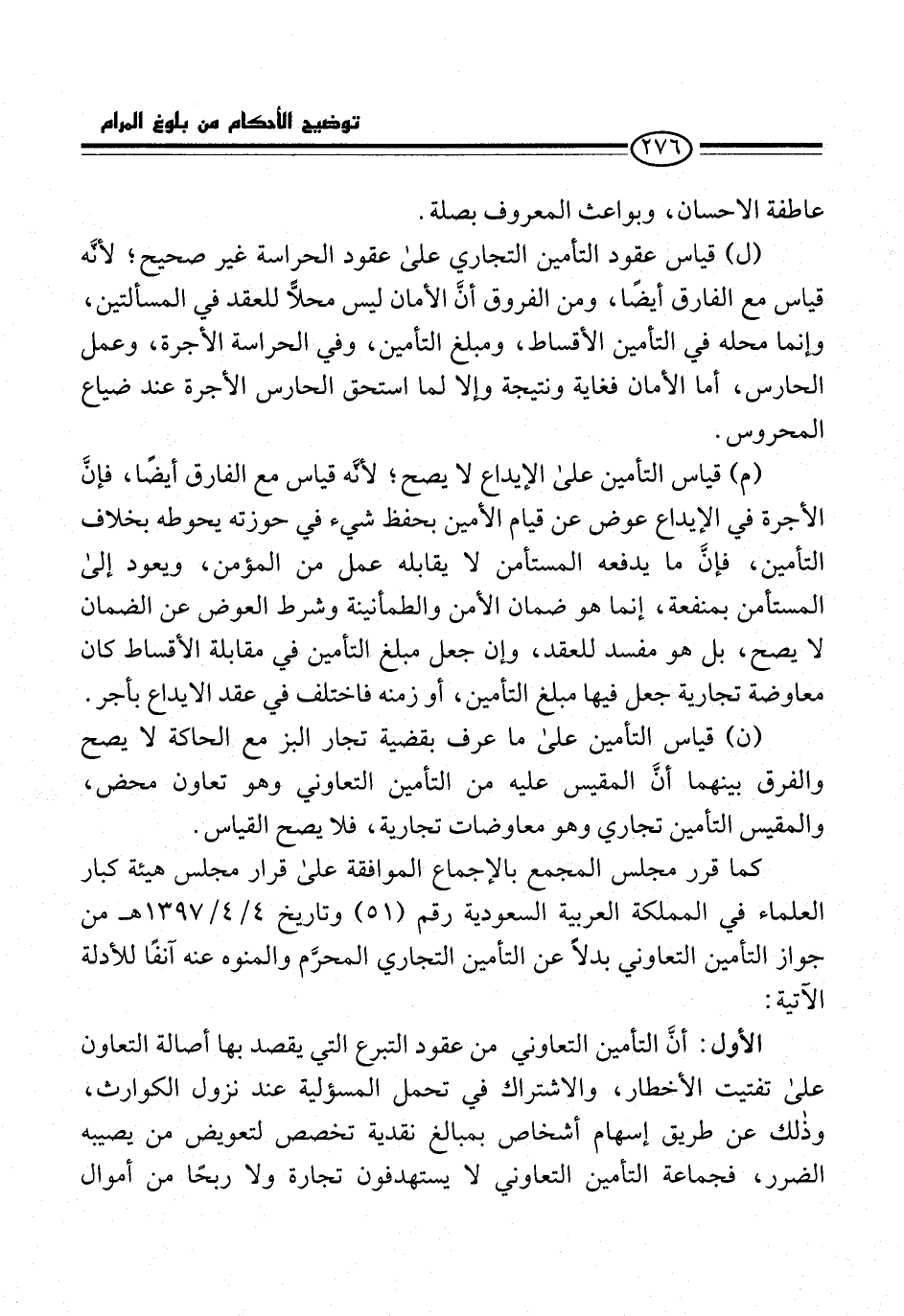 (ن) قياس التأمين على ما عرف بقضية تجار البز مع الحاكة لا يصح والفرق بينهما أنَّ المقيس عليه من التأمين التعاوني وهو تعاون محض، والمقيس التأمين تجاري وهو معاوضات تجارية، فلا يصح القياس.