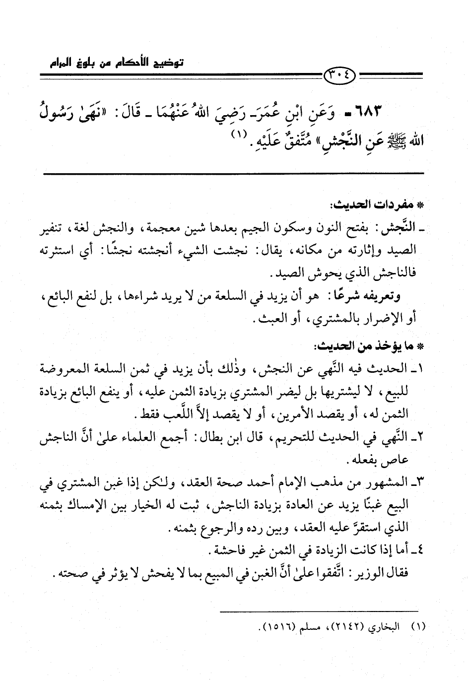 683 - وَعَنِ ابْنِ عُمَرَ -رَضِيَ اللهُ عَنْهُمَا- قَالَ: "نَهَى رَسُولُ الله -صلى الله عليه وسلم- عَنِ النَّجْشِ" مُتَّفقٌ عَلَيْهِ. (¬1)