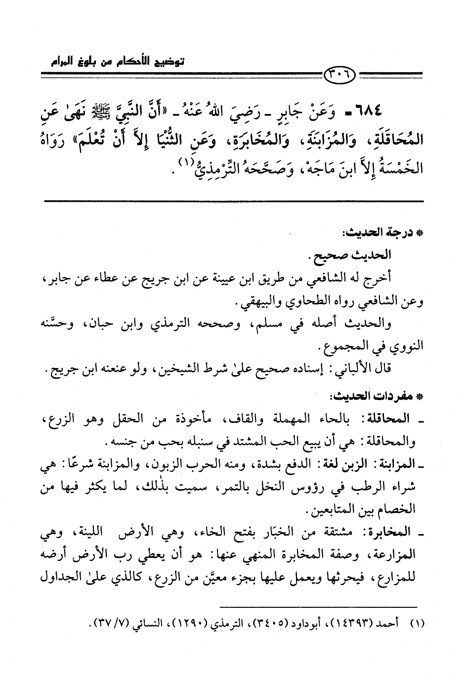 684 - وَعَنْ جَابِرٍ -رَضِيَ اللهُ عَنْهُ- "أَنَّ النَّبِيَّ -صلى الله عليه وسلم- نَهَى عَنِ المُحَاقَلَةِ، وَالمُزَابَنَةِ، وَالمُخَابَرَةِ، وَعَنِ الثُّنْيَا إِلاَّ أَنْ تُعْلَمَ" رَوَاهُ الخَمْسَةُ إِلاَّ ابنَ مَاجَهْ، وَصَحَّحَهُ التِّرْمِذِيُّ (¬1).