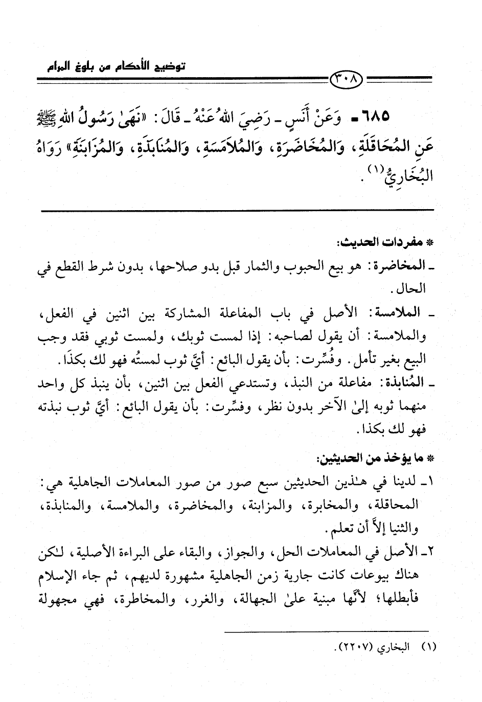 685 - وَعَنْ أَنَسٍ -رَضِيَ اللهُ عَنْهُ- قَالَ: "نَهَى رَسُولُ اللهِ -صلى الله عليه وسلم- عَنِ المُحَاقَلَةِ، وَالمُخَاضَرَةِ، وَالمُلاَمَسَةِ، وَالمُنَابَذَةِ، وَالمُزَابَنَةِ" رَوَاهُ البُخَارِيُّ (¬1).