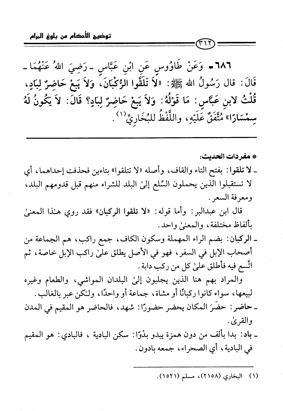 686 - وَعَنْ طَاوُوسٍ عَنِ ابْنِ عَبَّاسٍ -رَضِيَ اللهُ عَنْهُمَا- قَالَ: قال رَسُولُ الله -صلى الله عليه وسلم-: "لاَ تَلَقَّوا الرُّكْبَانَ، وَلاَ يَبعْ حَاضِرٌ لِبَادٍ، قُلْتُ لابنِ عَبَّاسٍ: مَا قَوْلُهُ: وَلاَ يَبعْ حَاضِرٌ لِبَادٍ؟ قَالَ: لاَ يَكُونُ لَهُ سِمْسَاراً" مُتَّفَقٌ عَلَيْهِ، واللَّفْظُ للبُخَارِيِّ (¬1).