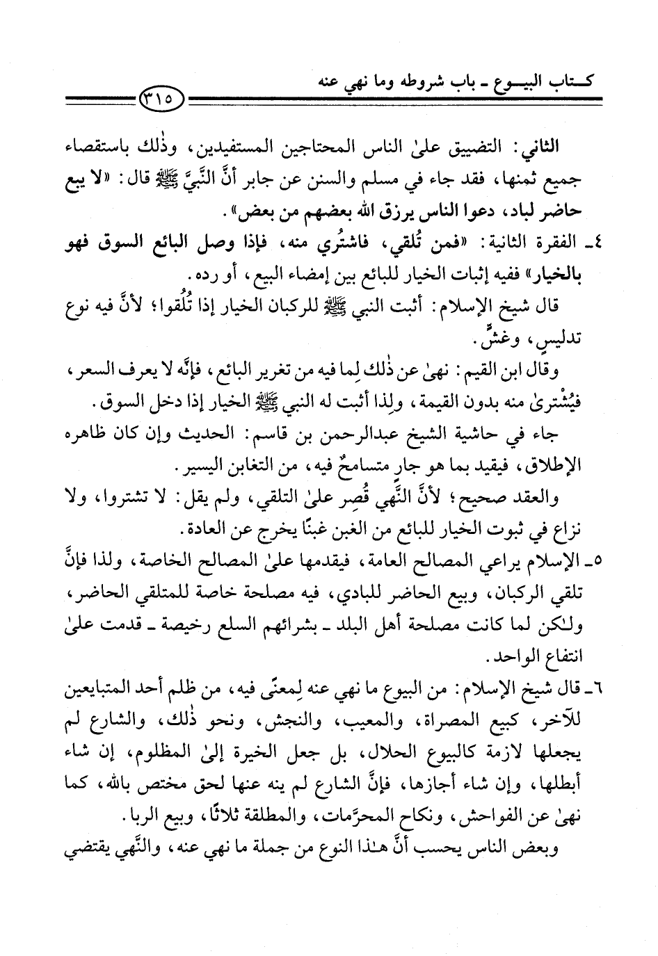 6 - قال شيخ الإسلام: من البيوع ما نهي عنه لِمعنىً فيه، من ظلم أحد المتبايعين للآخر، كبيع المصراة، والمعيب، والنجش، ونحو ذلك، والشارع لم يجعلها لازمة كالبيوع الحلال، بل جعل الخيرة إلى المظلوم، إن شاء أبطلها، وإن شاء أجازها، فإنَّ الشارع لم ينه عنها لحق مختص بالله، كما نهى عن الفواحش، ونكاح المحرَّمات، والمطلقة ثلاثاً، وبيع الربا.