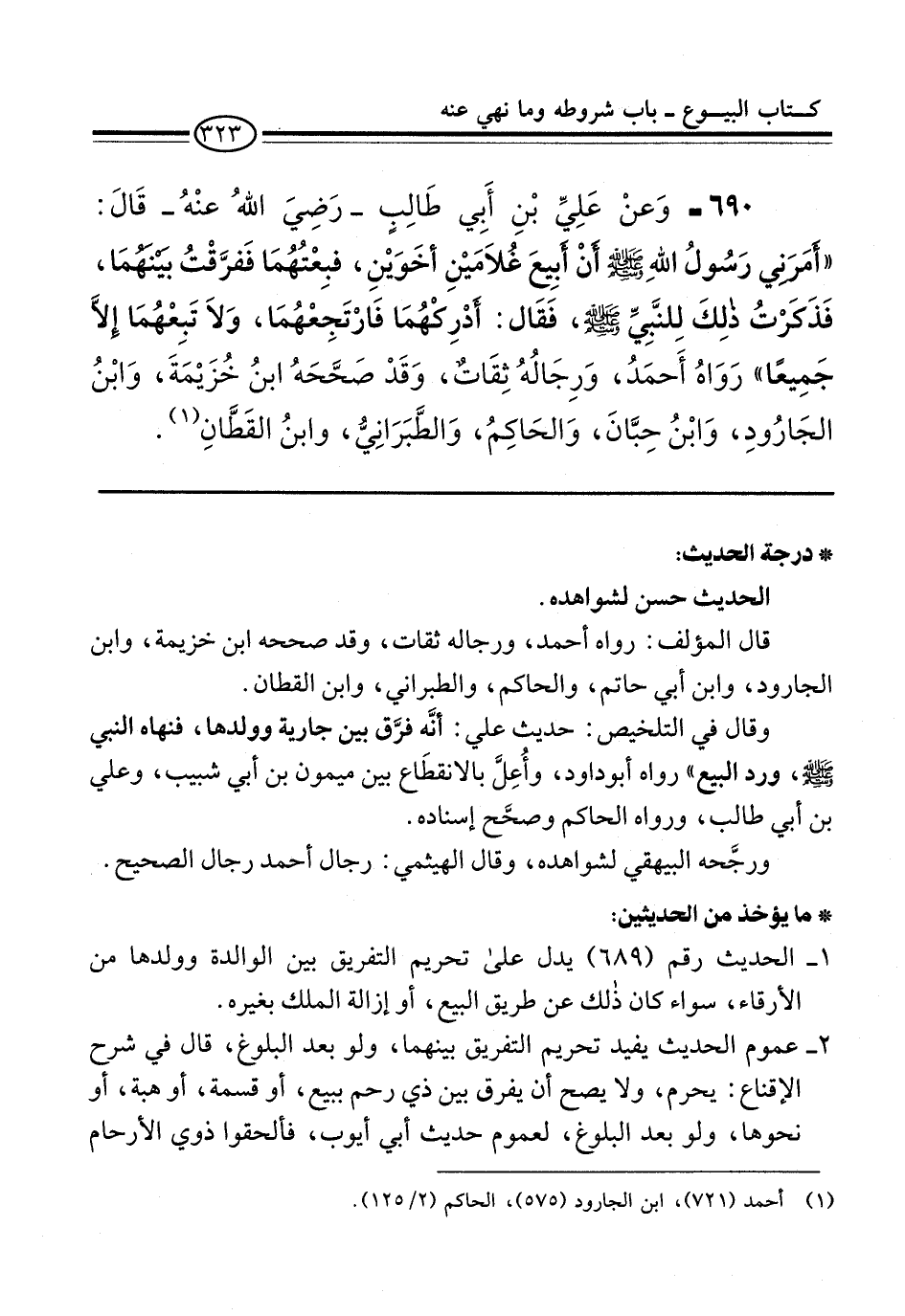 690 - وَعنْ عَلِيِّ بْنِ أَبِي طَالِبٍ -رَضِيَ اللهُ عنْهُ- قَالَ: "أَمَرَنِي رَسُولُ اللهِ -صلى الله عليه وسلم- أَنْ أَبِيعَ غُلاَمَيْنِ أخَوَيْنِ، فبِعْتُهُمَا فَفرَّقْتُ بَيْنَهُمَا، فَذَكَرْتُ ذلِكَ لِلنَّبِيِّ -صلى الله عليه وسلم-، فَقَال: أدْرِكْهُمَا فَارْتَجِعْهُمَا، وَلاَ تَبِعْهُمَا إِلاَّ جَمِيعاً" رَوَاهُ أَحمَدُ، وَرِجَالُهُ ثِقَات، وَقَدْ صَحَّحَهُ ابنُ خُزَيْمَةَ، وَابْنُ الجَارُودِ، وَابْنُ حِبَّانَ، وَالحَاكِمُ، وَالطَّبَرَانِيُّ، وابنُ القَطَّانِ (¬1).