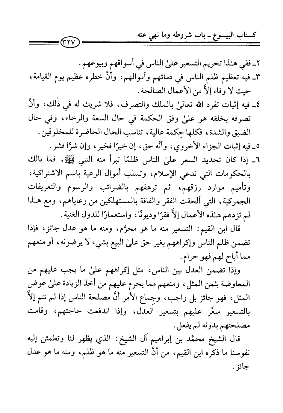 قال الشيخ محمَّد بن إبراهيم آل الشيخ: الذي يظهر لنا وتطمئن إليه نفوسنا ما ذكره ابن القيم، من أنَّ التسعير منه ما هو ظلم، ومنه ما هو عدل جائز.