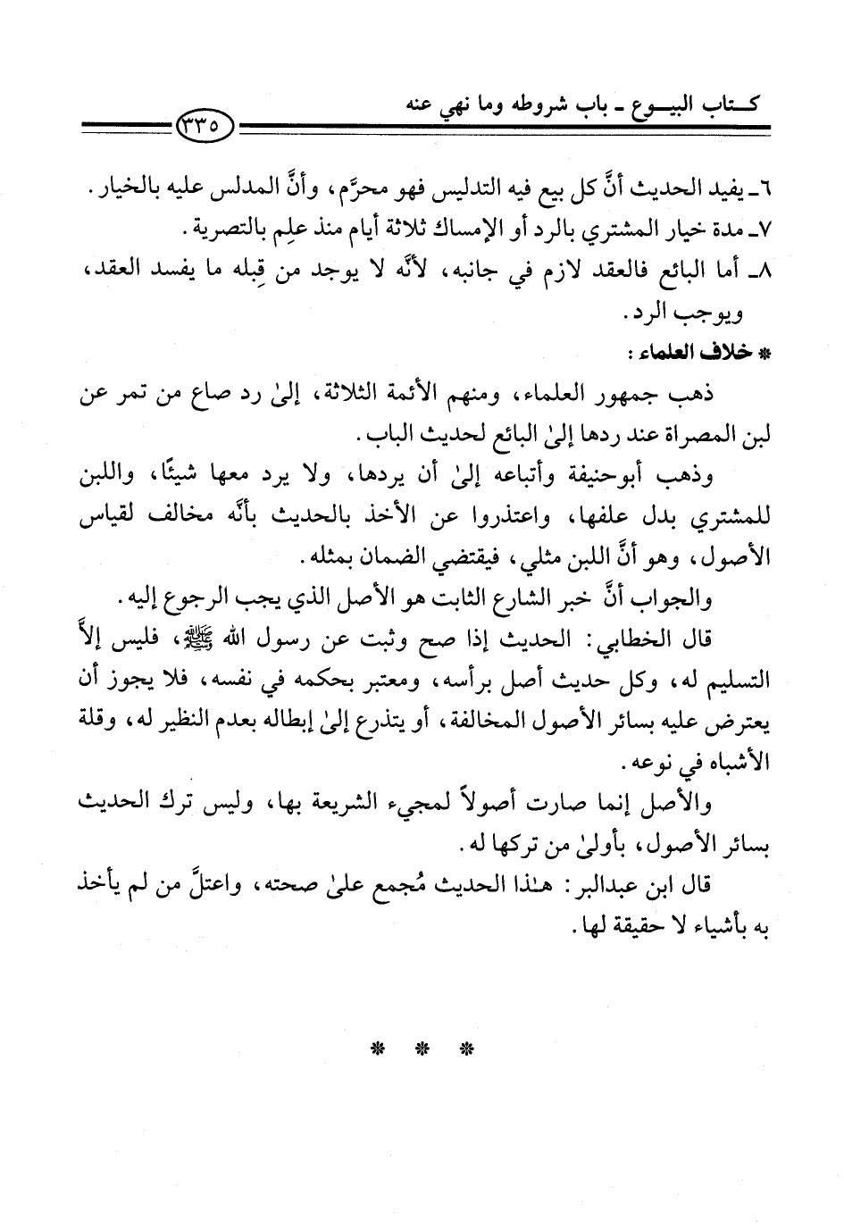 وذهب أبو حنيفة وأتباعه إلى أن يردها، ولا يرد معها شيئًا، واللبن للمشتري بدل علفها، واعتذروا عن الأخذ بالحديث بأئَه مخالف لقياس الأصول، وهو أنَّ اللبن مثلي، فيقتضي الضمان بمثله.