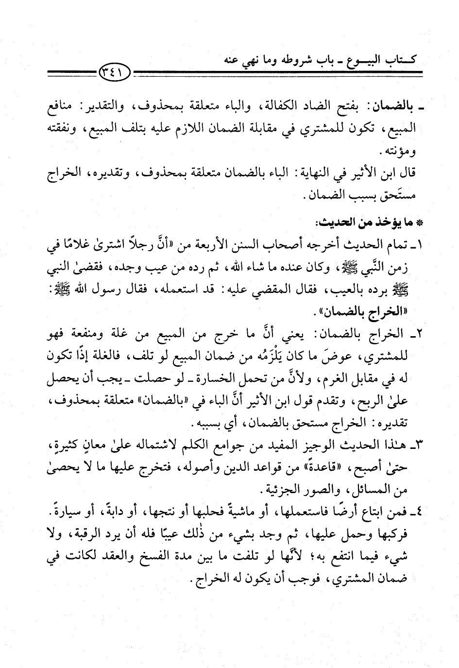 - بالضمان: بفتح الضاد الكفالة، والباء متعلقة بمحذوف، والتقدير: منافع المبيع، تكون للمشتري في مقابلة الضمان اللازم عليه بتلف المبيع، ونفقته ومؤنته.