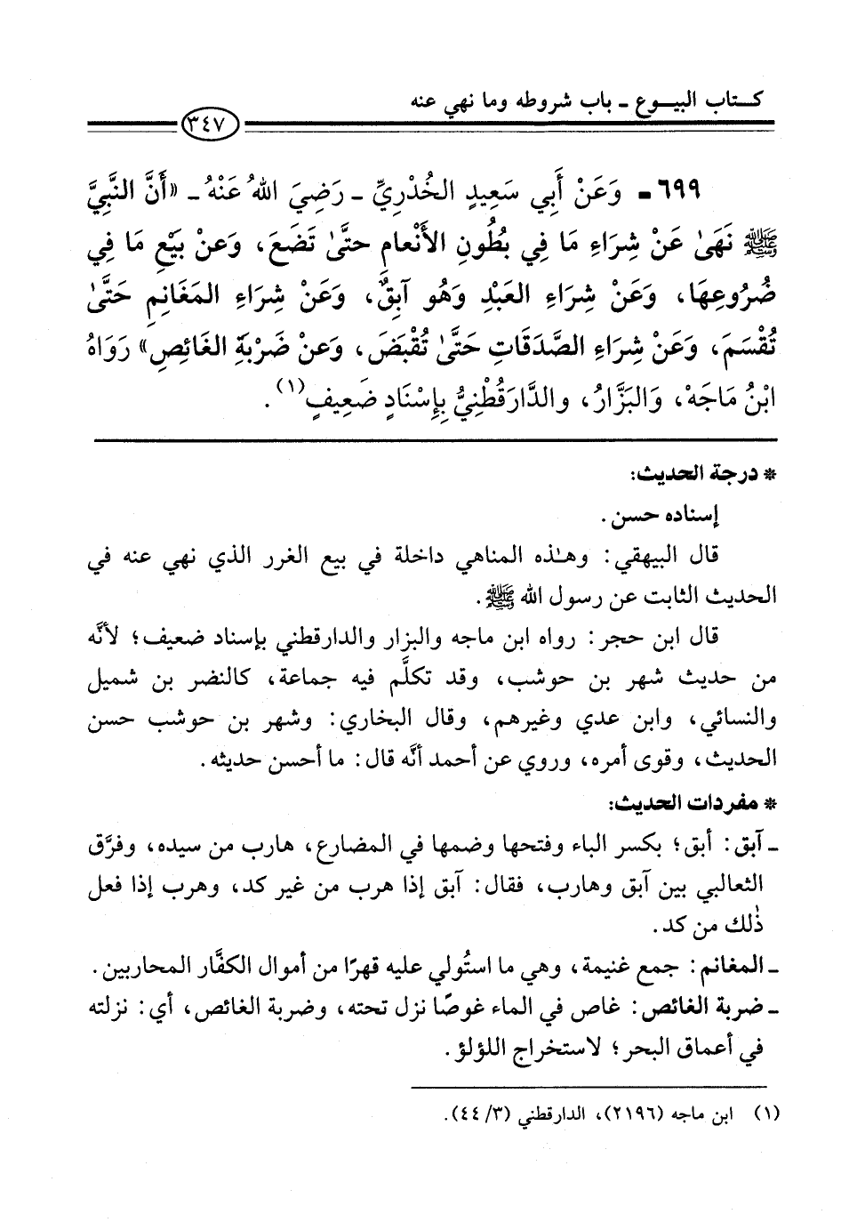 699 - وَعَنْ أَبِي سَعِيدٍ الخُدْرِيِّ -رَضِيَ اللهُ عَنْهُ- "أَنَّ النَّبِيَّ -صلى الله عليه وسلم- نَهَى عَنْ شِرَاءِ مَا فِي بُطُونِ الأَنْعامِ حتَّى تَضَعَ، وَعنْ بَيْعِ مَا فِي ضُرُوعِهَا، وَعَنْ شِرَاءِ العَبْدِ وَهُو آبِقٌ، وَعَنْ شِرَاءِ المَغَانِمِ حَتَّى تُقْسَمَ، وَعَنْ شِرَاءِ الصَّدَقَاتِ حَتَّى تُقْبضَ، وَعنْ ضَرْبه الغَائِصِ" رَوَاهُ ابْنُ مَاجَهْ، وَالبَزَّارُ، والدَّارَقُطْنِيُّ بِإِسْنَادٍ ضَعِيفٍ (¬1).